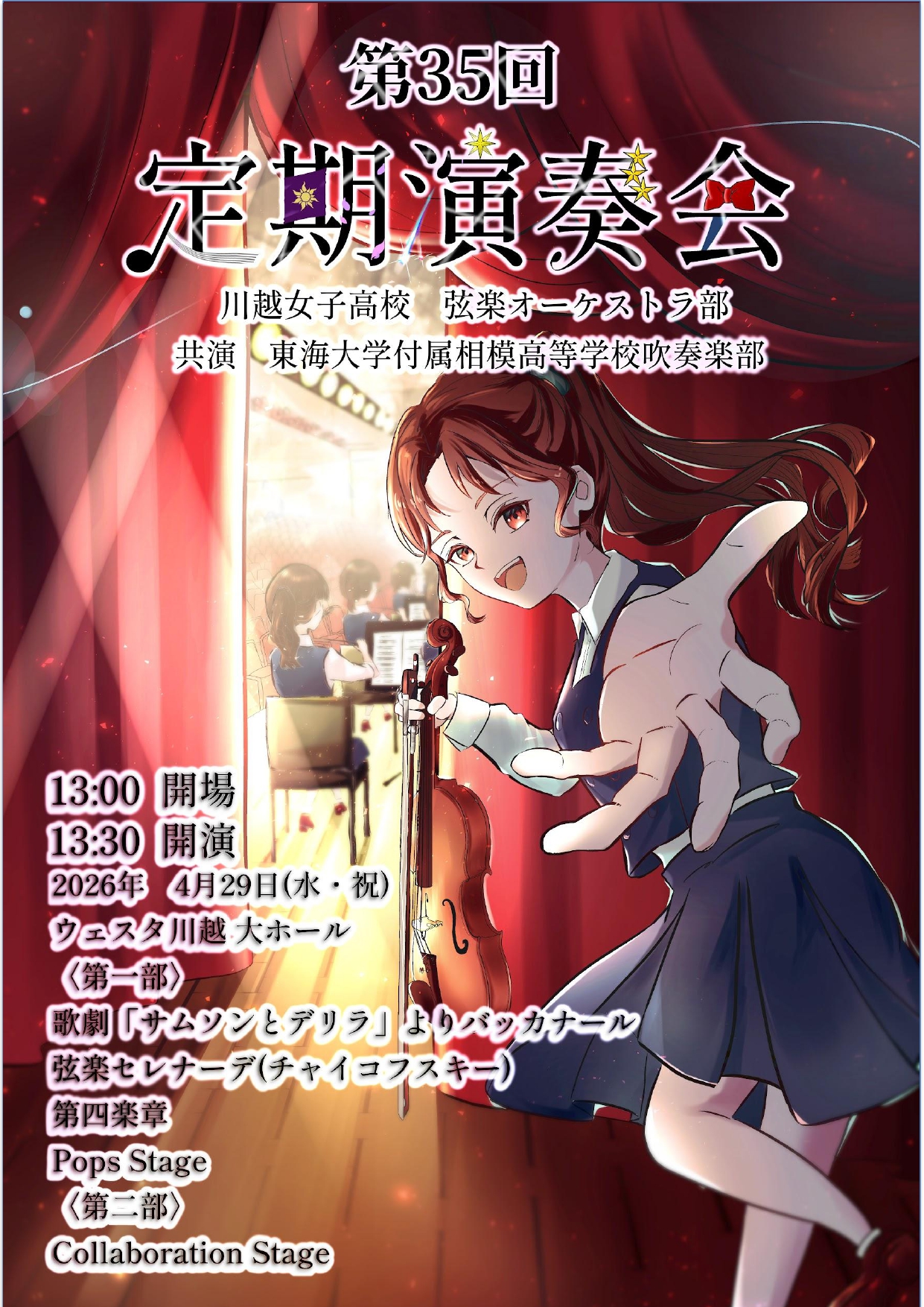 春光うららかな今日この頃、皆様におかれましては、益々ご健勝のこととお慶び申し上げます。 私たち吹奏楽部は、今年も川越女子高校弦楽オーケストラ部の「第35回定期演奏会」に賛助出演することとなりました。つきましては、ご多忙中とは存じますが、何卒ご来場賜りたく、ここにご案内申し上げます。